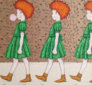 Con un sorriso si può tutto presenta una serie di opere, eseguite a partire dal 2010, tutte accomunate da tre elementi che colpiscono immediatamente: le capigliature dai toni infiammati, il fatto che i soggetti rappresentino sempre adolescenti o bambine, e i volti “vuoti”, privi di colore e di qualsiasi tratto fisiognomico, forse l’aspetto più spiazzante ad un primo sguardo.